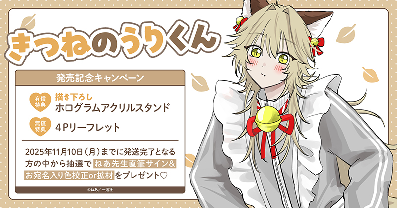 直筆サイン入り色校正or拡材が当たる!ねあ先生『きつねのうりくん』発売記念キャンペーン開催!【ホーリンラブブックス】
