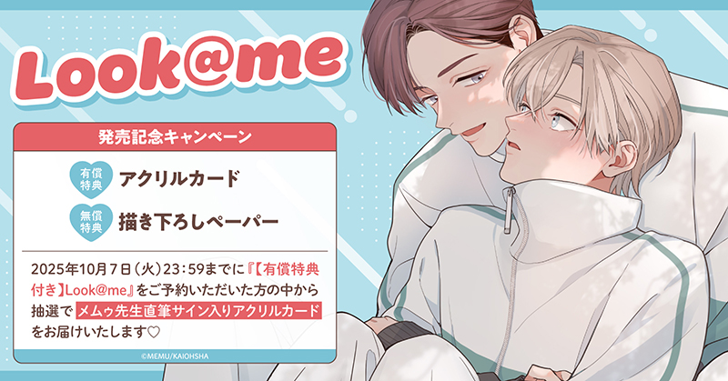 直筆サイン入りアクリルカードが当たる!メムゥ先生『Look@me』発売記念キャンペーン開催!【ホーリンラブブックス】