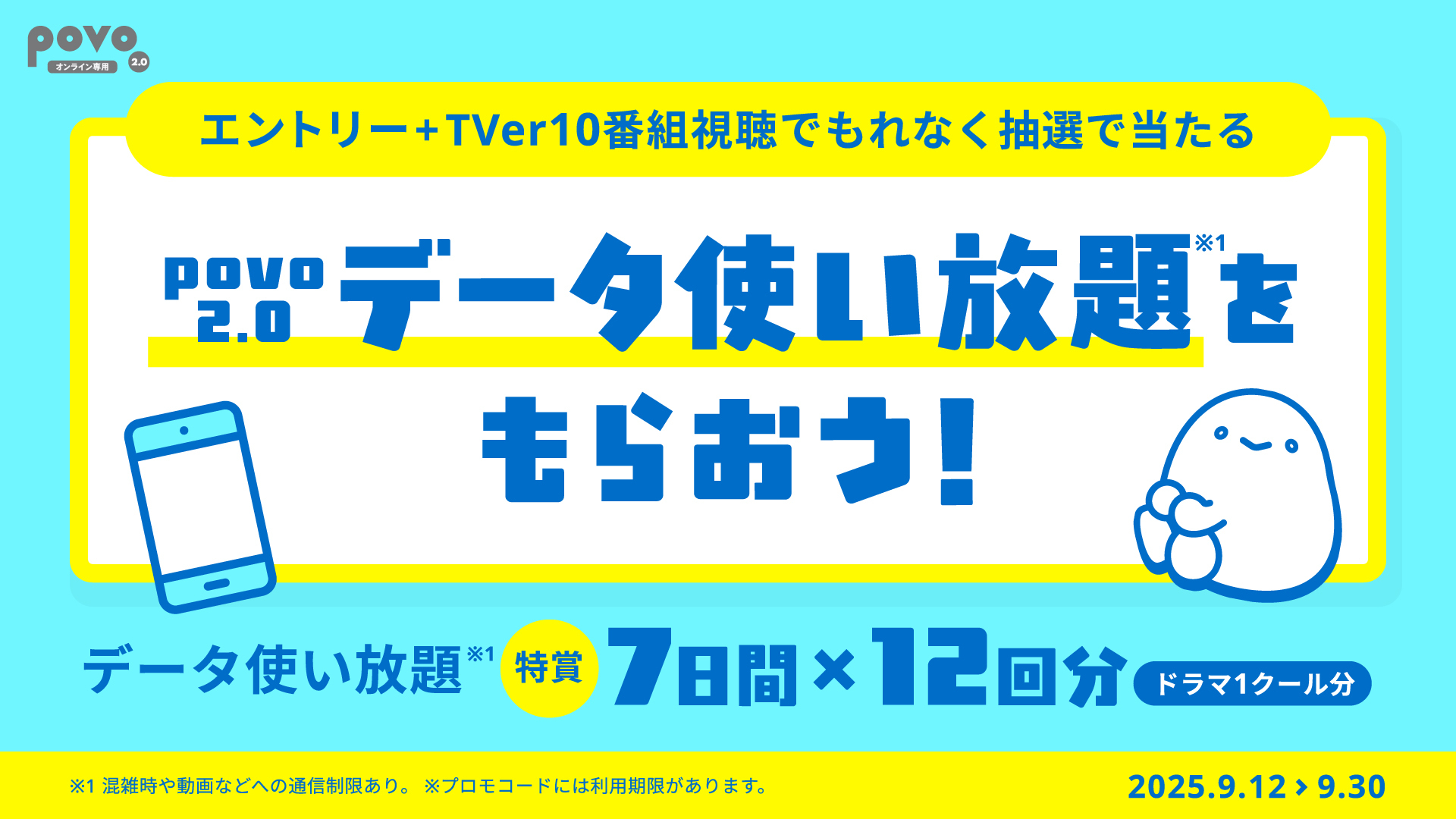 【TVer】povo2.0のクーポンが獲得できるキャンペーンを開催 データ使い放題トッピングが最大で7日間×12回分当たる!
