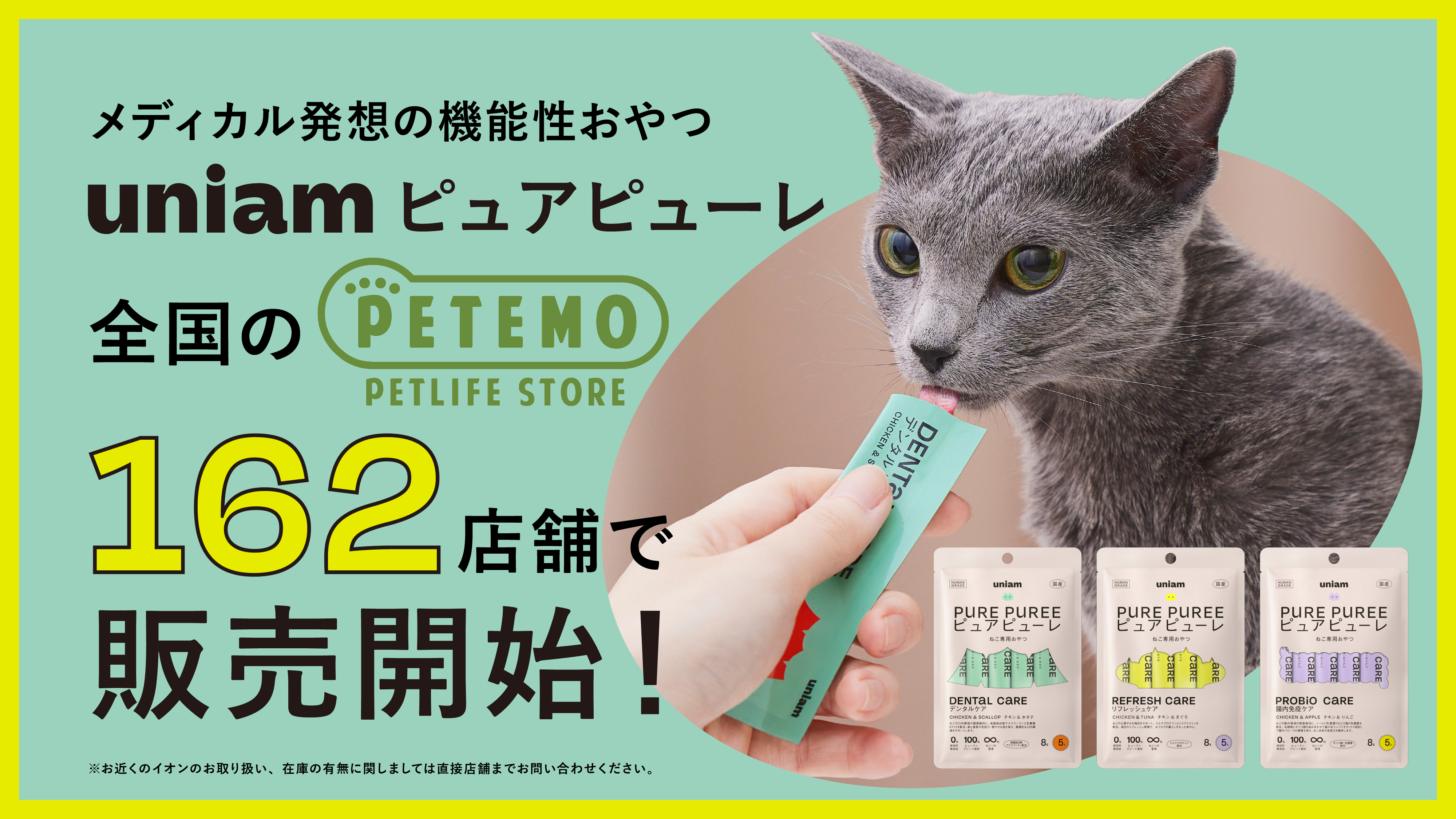 【ねこ特化ヘルスケアブランドuniam】イオンペット運営のペテモ全国162店舗で、メディカル発想の機能性おやつ「ピュアピューレ」を販売開始