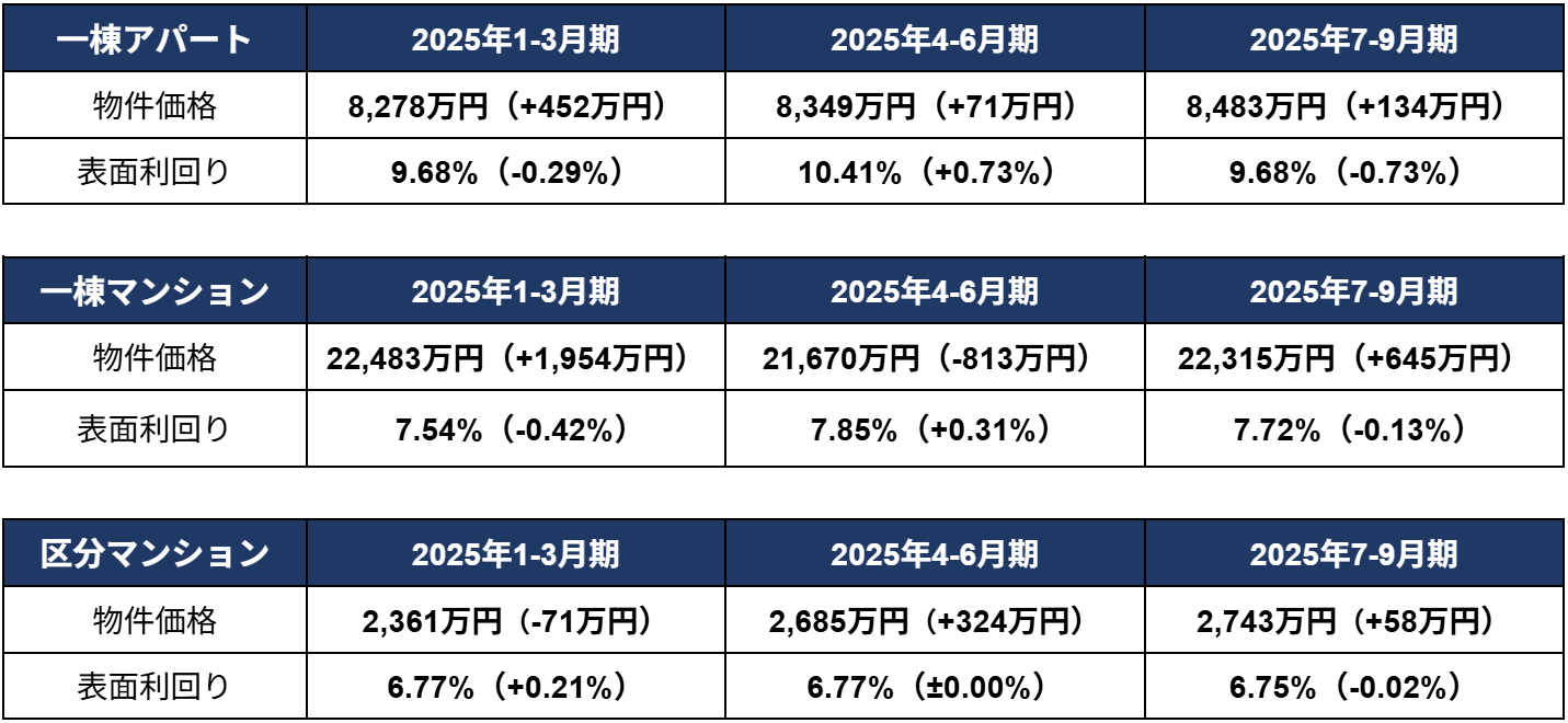 投資用物件の価格が全種別で上昇、一棟アパート・区分マンションは過去最高額を更新