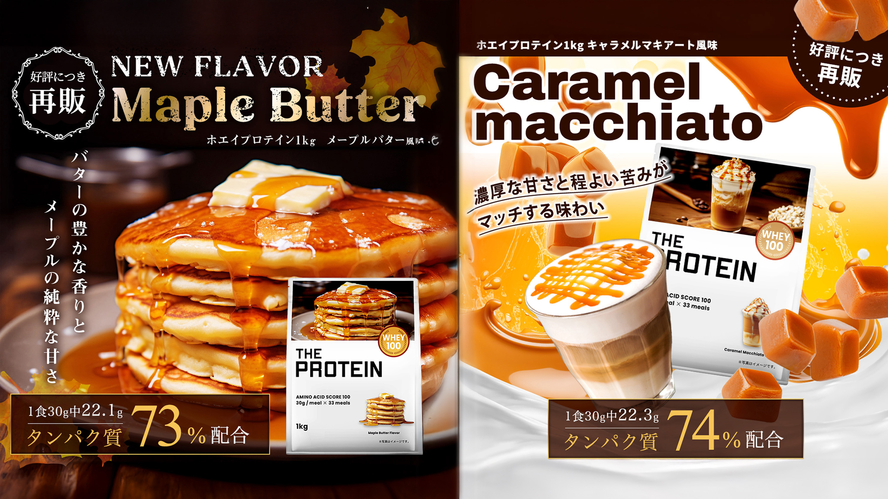 【プロテインでカフェ気分!?】THE PROTEIN(通称:ザプロ)から罪悪感なく楽しめちゃう甘いご褒美〈キャラメルマキアート風味〉と〈メープルバター風味〉が再販開始!