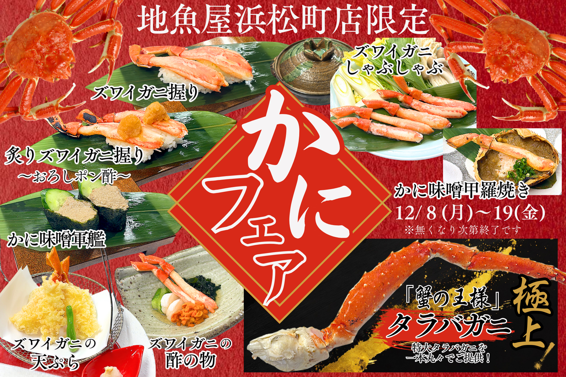 極上の贅沢!!「蟹の王様」特大タラバガニとズワイガニを堪能!地魚屋 浜松町店にて12月8日(月)から12日間限定で「かにフェア」を開催