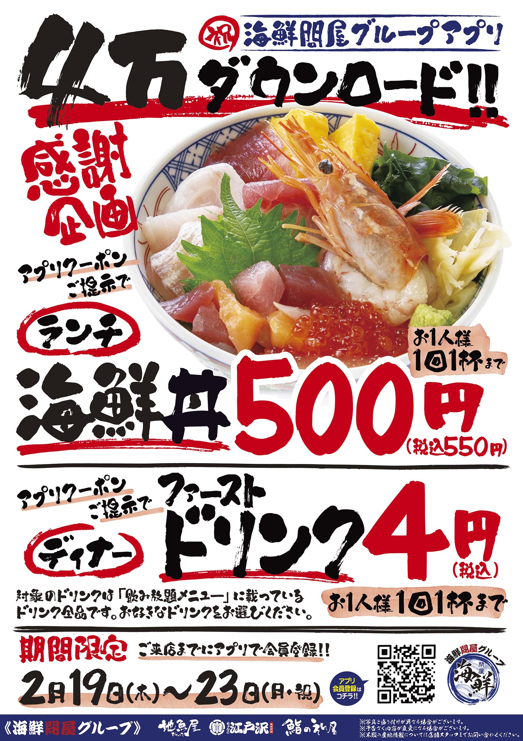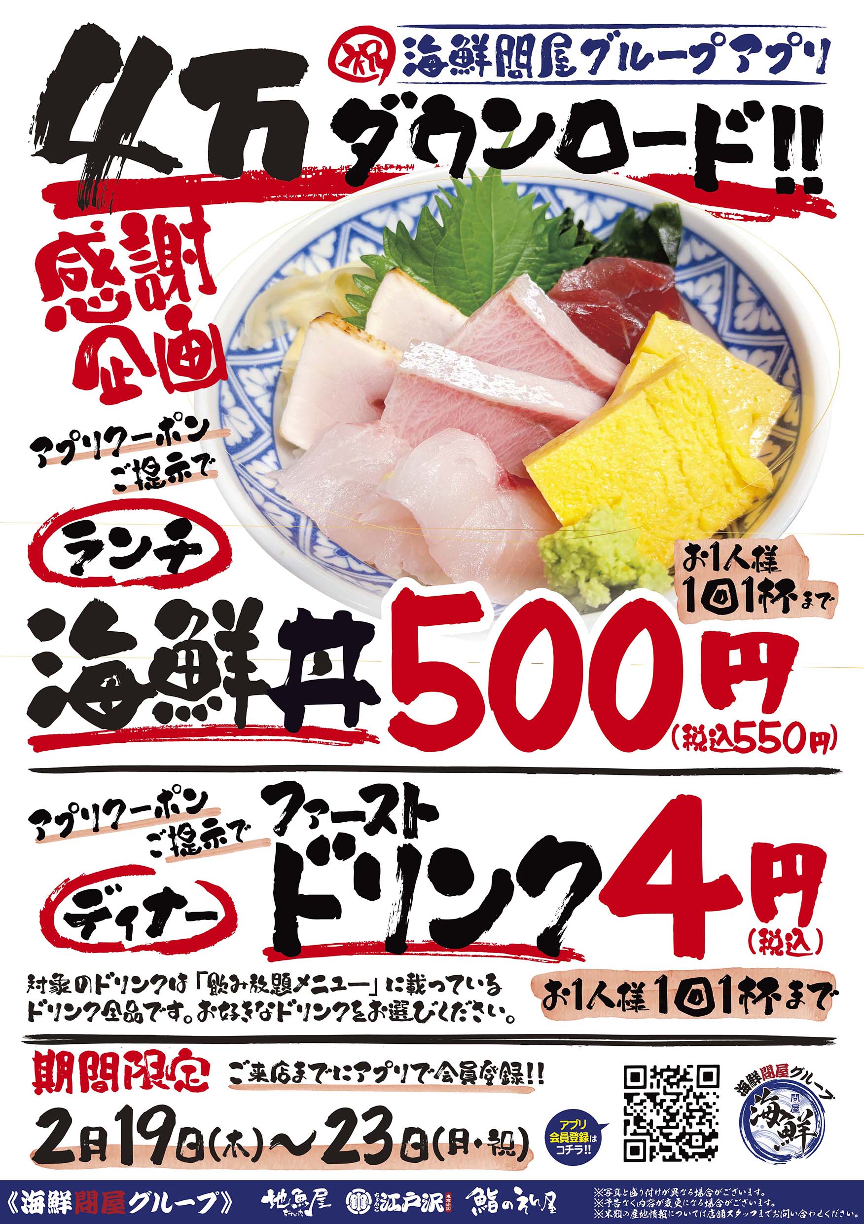 【地魚屋】アプリ4万ダウンロード記念!ランチとディナーで感謝イベントを開催いたします(PR TIMES グルメ)