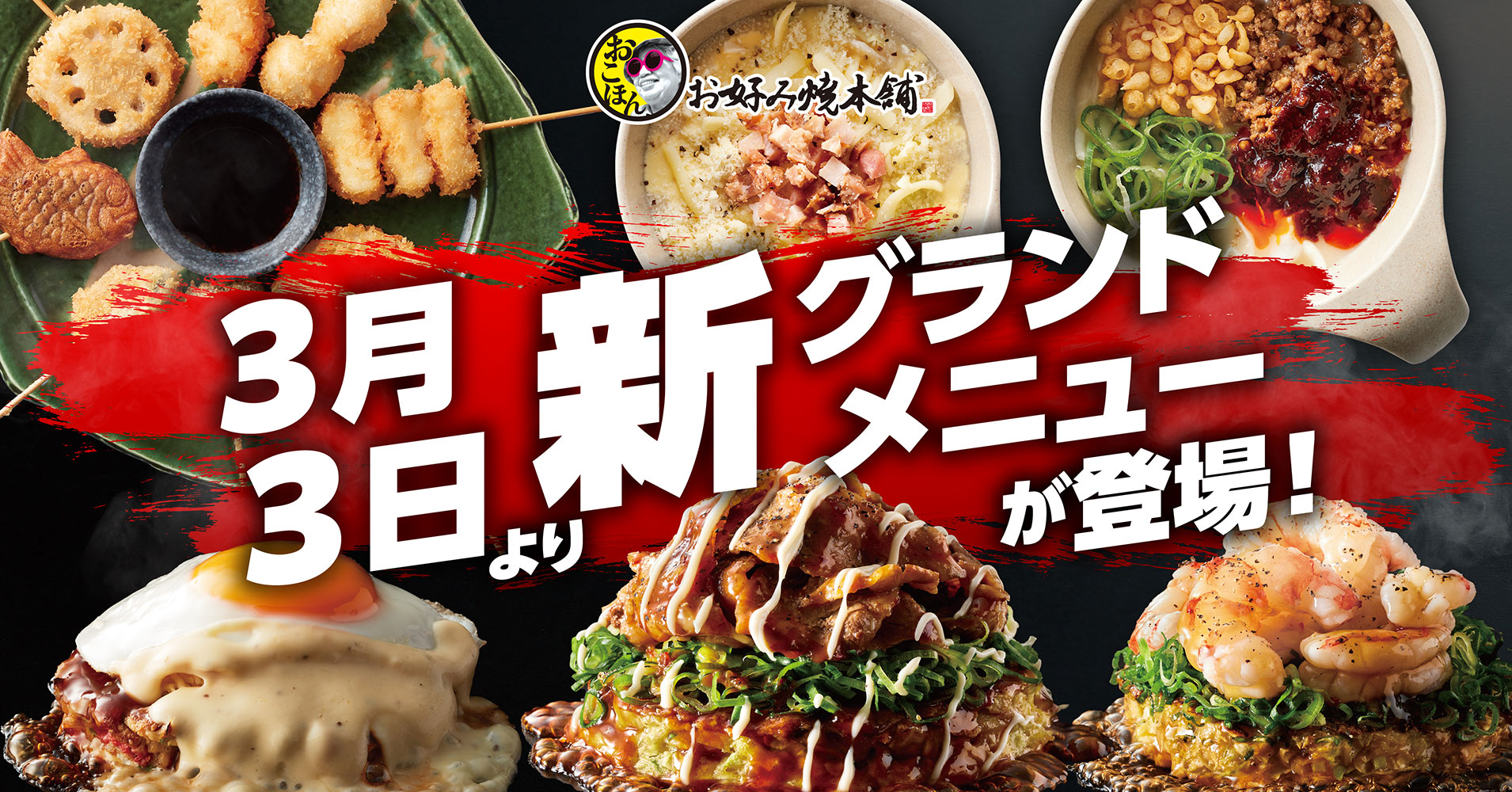 【お好み焼本舗】3月3日(火)から!「【超贅沢】月見チーズ玉」や「旨辛麻婆もんじゃ」など新商品を販売
