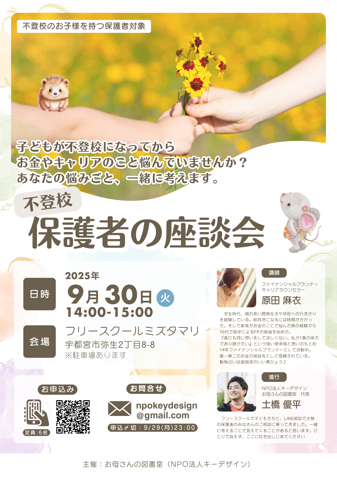 不登校保護者の座談会「お金とキャリアの悩み、一緒に考えます」を宇都宮で9/30(火)開催