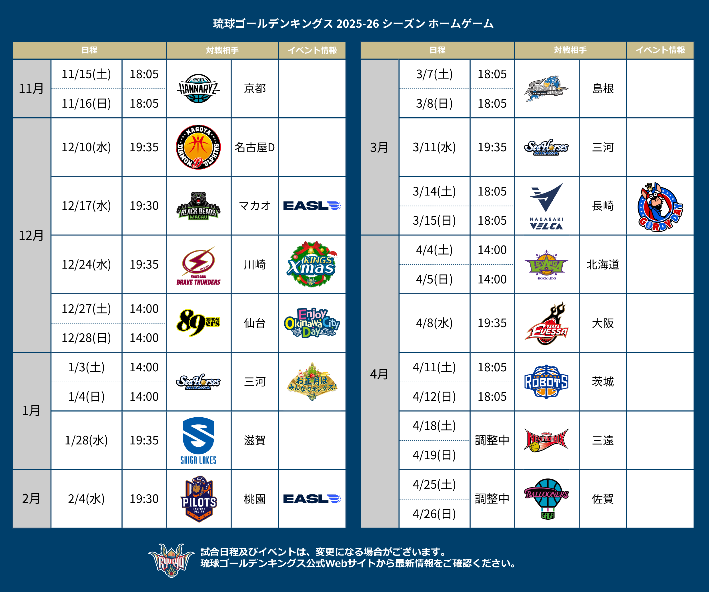 りそなグループ B.LEAGUE 2025-26 SEASON 後半戦(19節-31節) 試合開始時間決定のお知らせ
