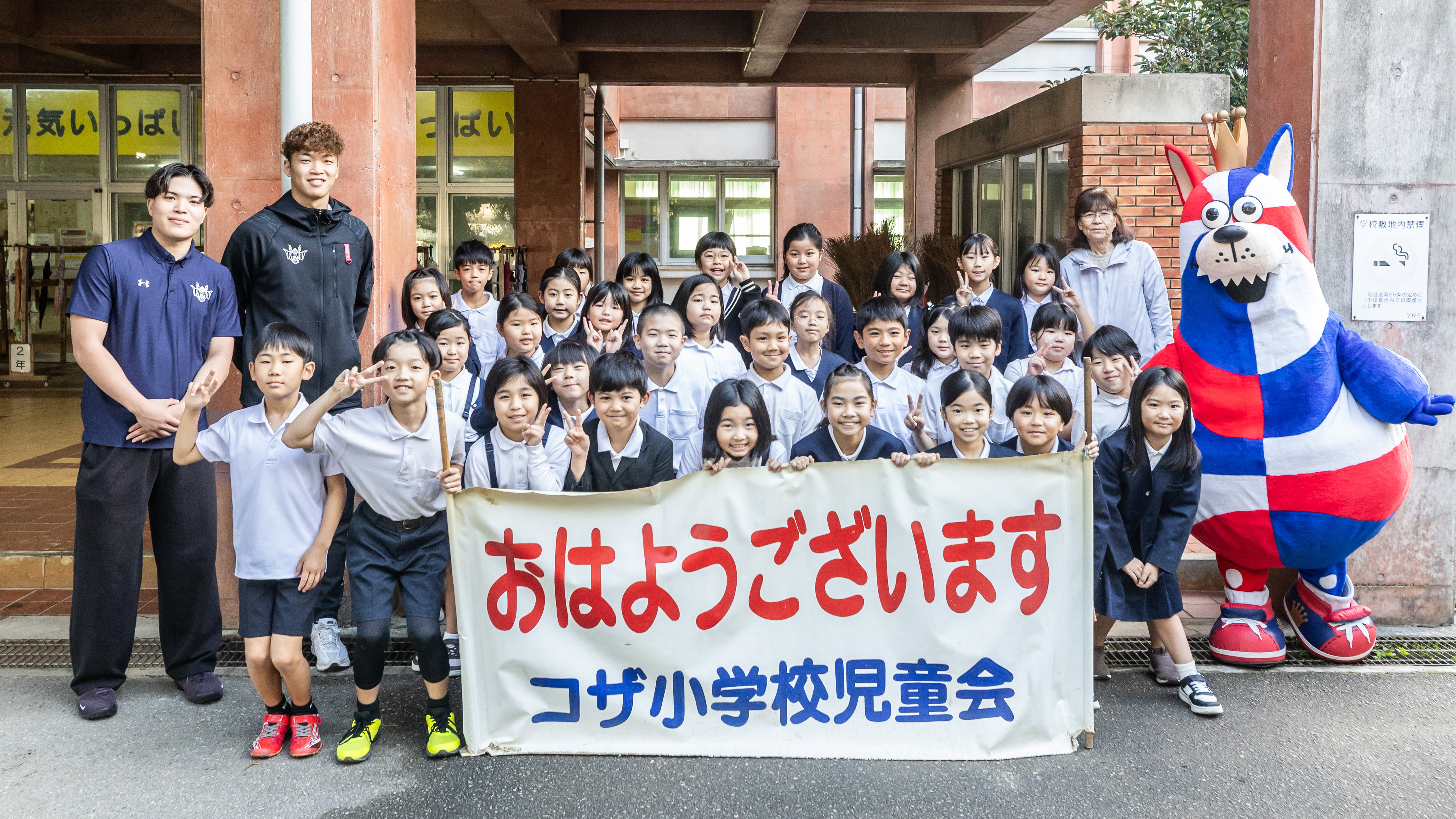 #17 崎濱選手、#18 脇選手がゴーディーと一緒に朝のあいさつ運動に参加しました!