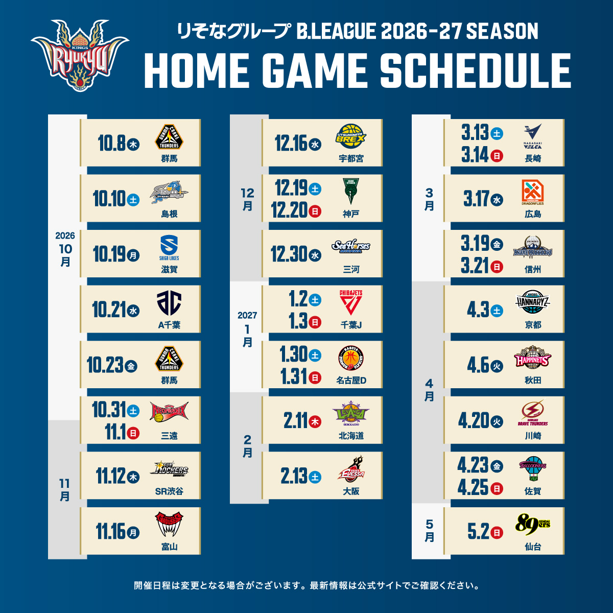 りそなグループ B.LEAGUE 2026-27 SEASON「B.PREMIER」カーディング決定のお知らせ