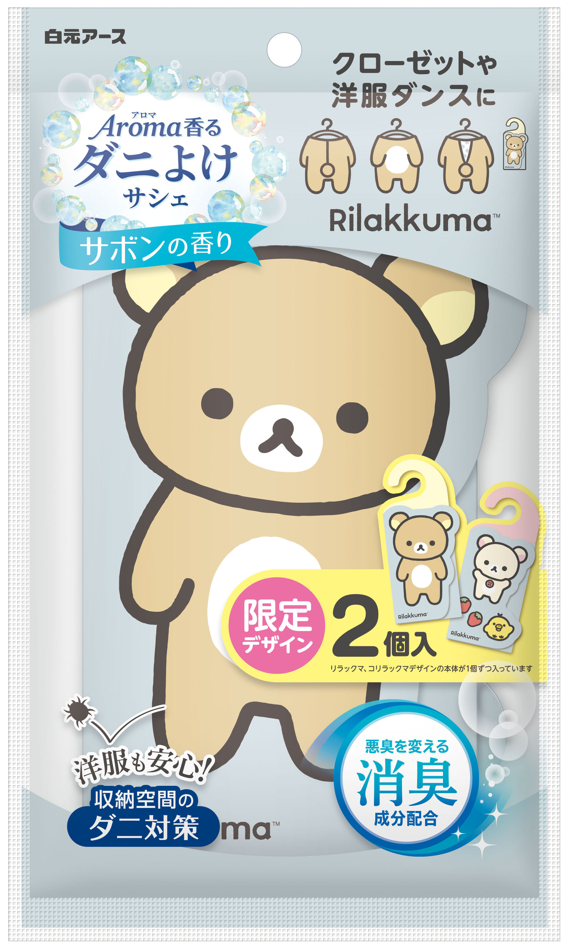 衣類の収納空間にかけるだけで簡単ダニ対策『アロマ香る ダニよけサシェ サボンの香り リラックマ』数量限定発売