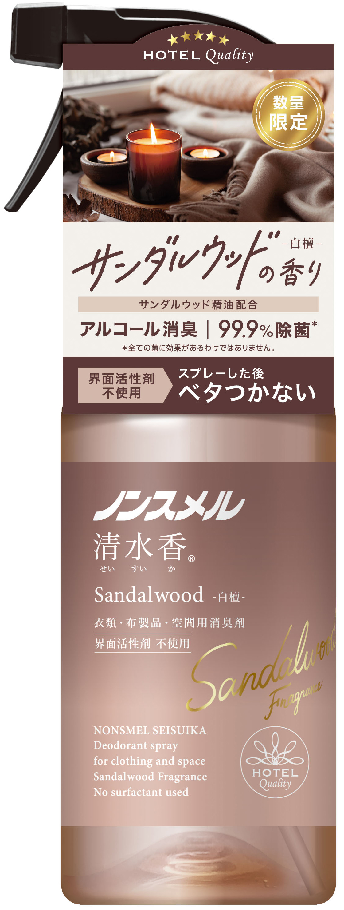 アルコール消臭×界面活性剤ゼロ処方で、乾きが速く、ベタつかない!ホテルクオリティの消臭剤に心落ち着く限定の香りが登場!『ノンスメル清水香(せいすいか) サンダルウッドの香り』 数量限定発売