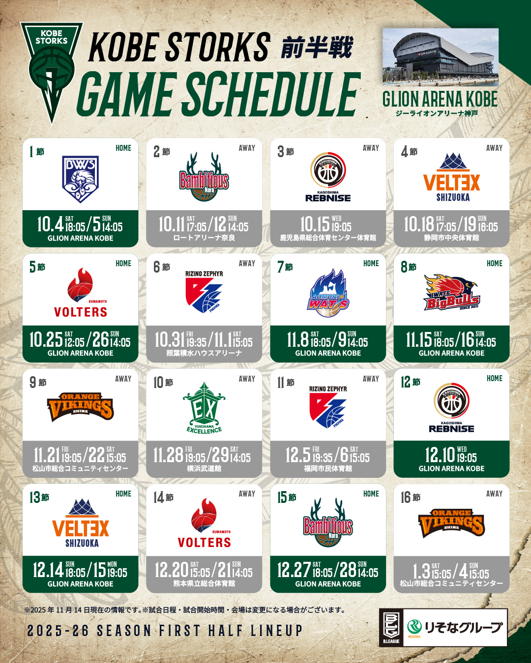 りそなグループBリーグ 2025-26シーズン後半戦ホームゲーム 試合開始時間 決定のお知らせ