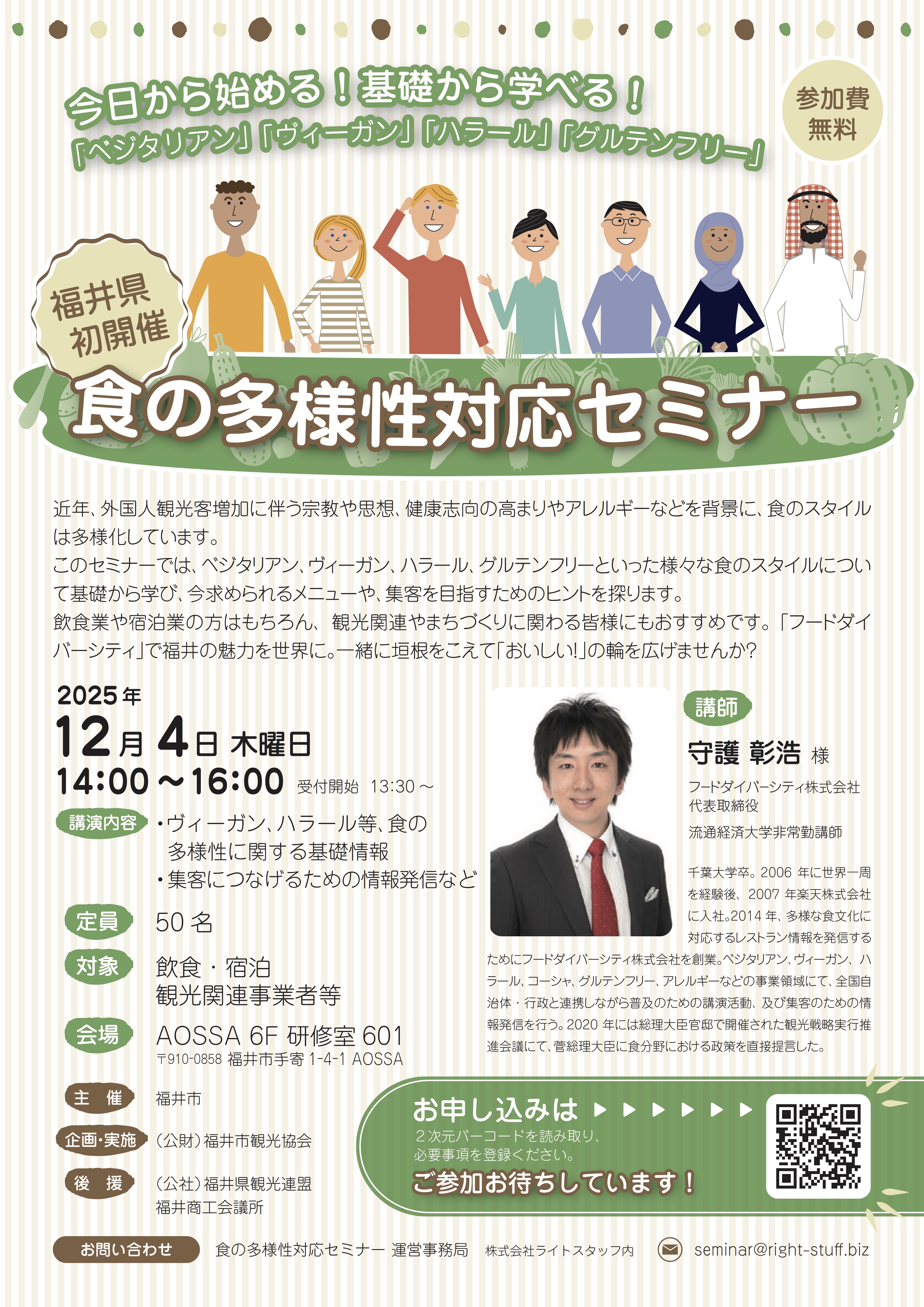 【福井県福井市】世界の食文化を学ぼう!今日から始める!基礎から学べる!「食の多様性対応セミナー」12/4(木)開催|参加者募集中!