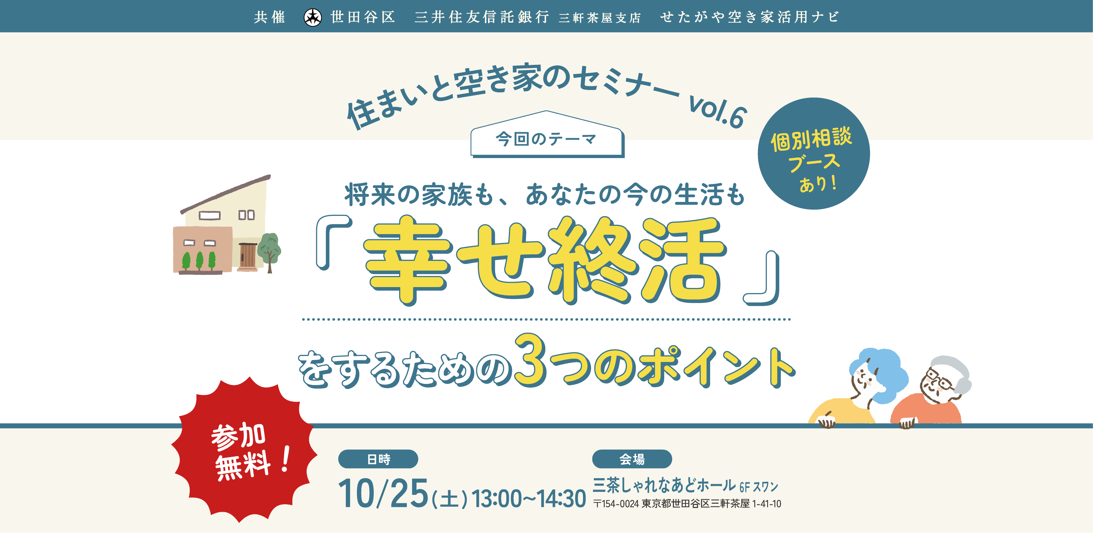 【参加無料】世田谷区主催「幸せ終活」を学ぶ!住まいと空き家のセミナー|10/25(土)