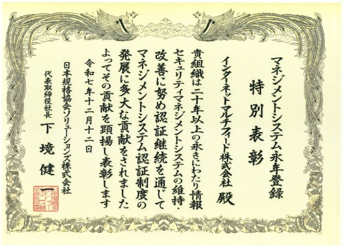 ISO/IEC 27001「マネジメントシステム永年登録(特別表彰)」を受賞