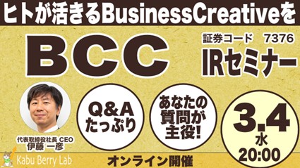 BCC株式会社 個人投資家向け「Kabu Berry Lab IRセミナー」登壇のお知らせ