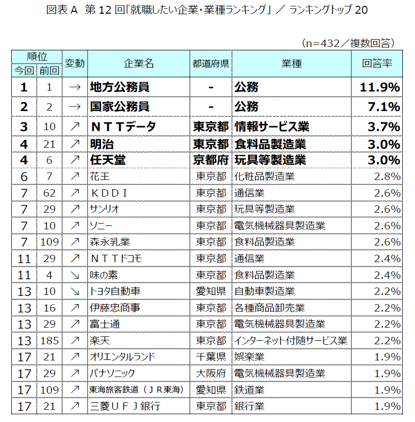 第12回「就職したい企業・業種ランキング」発表 ~1位は「地方公務員」、トップ20は国内企業が独占~