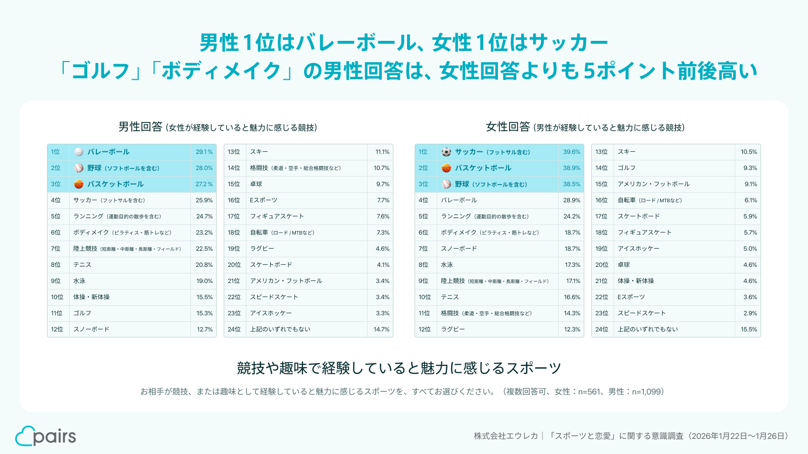 恋愛の相手が魅力的に見えるスポーツ、男性回答1位は「バレーボール」、女性回答1位は「サッカー」 ペアーズ、「スポーツと恋愛」意識調査