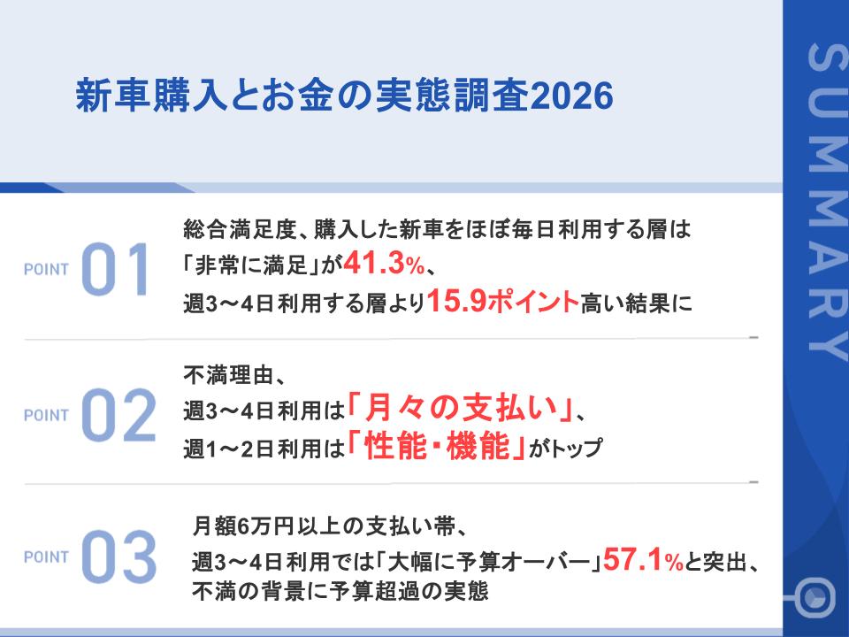 新車購入者の9割以上が「満足」も、不満理由は金銭面が上位にほぼ毎日使用は「維持費」、週3~4日は「月々の支払い」が最多回答