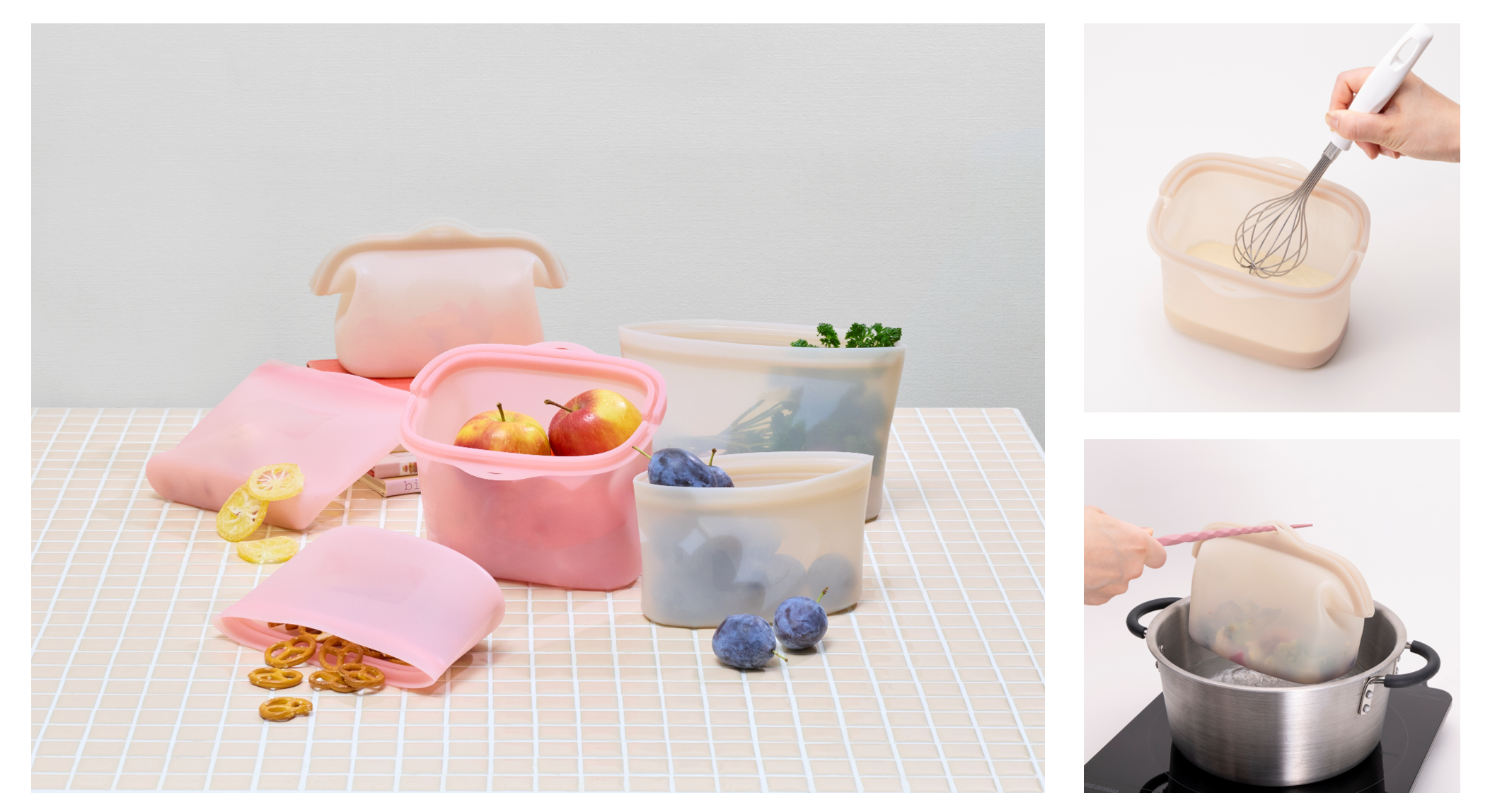 【電子レンジ・オーブン・湯煎・冷蔵・冷凍も全部OK!】下ごしらえ、加熱調理、保存までできる万能シリコーンバッグにしっかり口がひらくタイプが新登場!