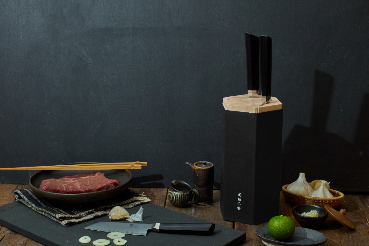 関孫六の最高峰シリーズ「マスターライン」からゴムの弾力でキズが付きにくいまな板と高級感のあるデザインのナイフブロックが新登場!