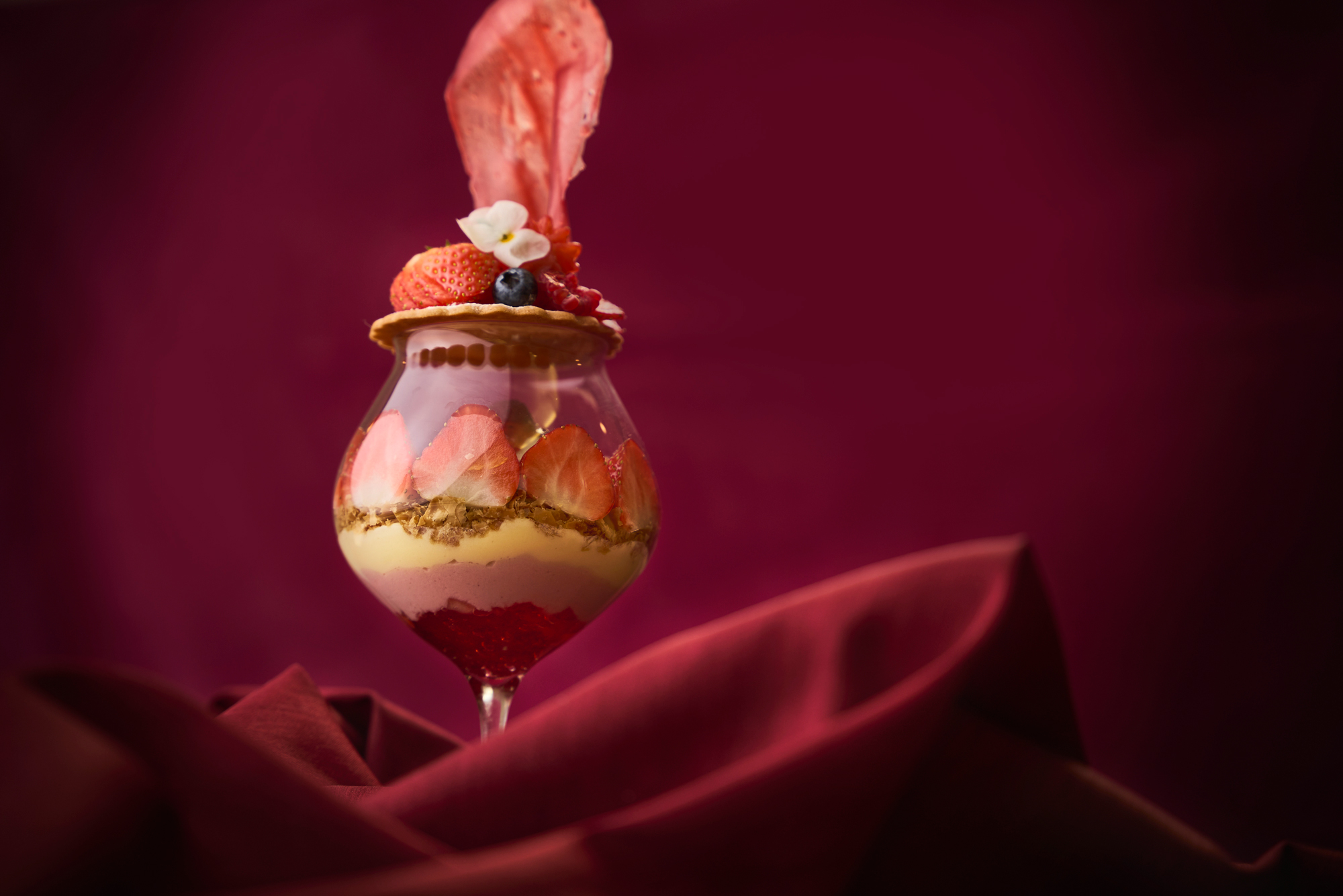 【ウェスティン都ホテル京都】旬を迎えた奈良県ブランド「古都華」をたっぷりと使用した苺づくしの贅沢パフェ「パフェ フリュイルージュ」が登場