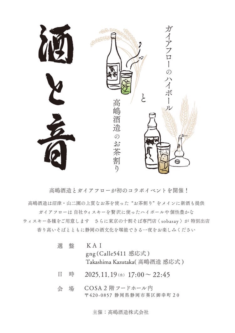 【ご案内】11月19日(水)高嶋酒造とガイアフローが初コラボ!音楽・酒・食を楽しむ「酒と音」cosaで開催!!