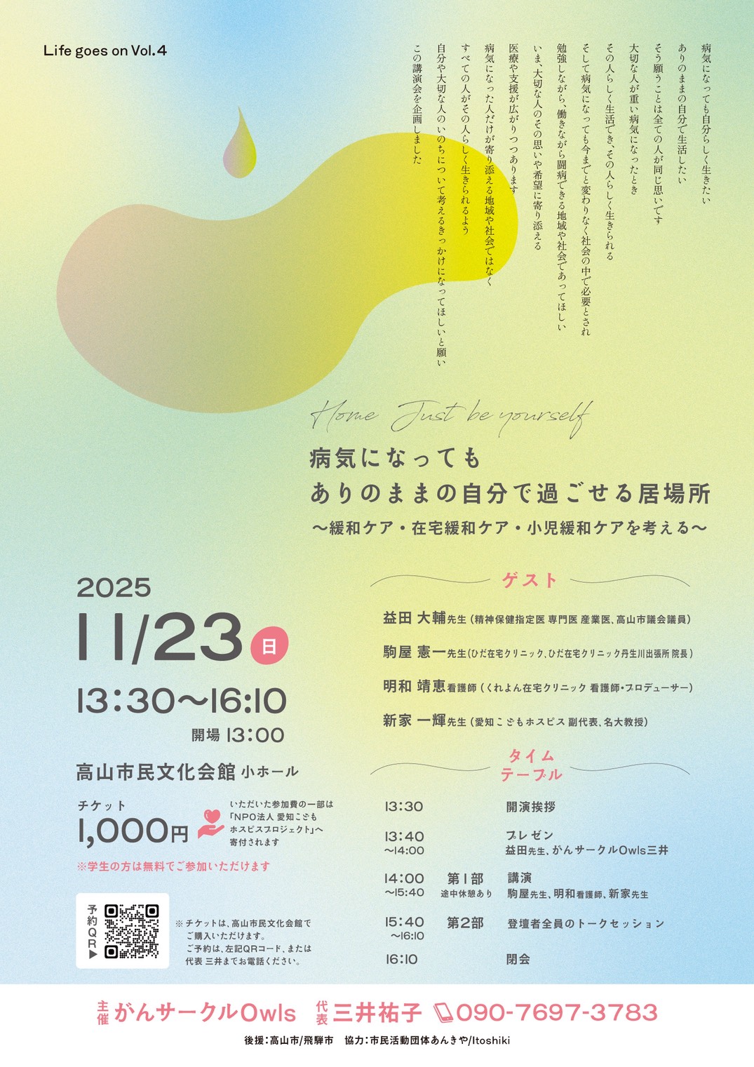 【飛騨高山・岐阜県高山市】「病気になってもありのままの自分で過ごせる居場所 ~緩和ケア・在宅ケア・小児緩和ケアを考える~」講演会が開催されます