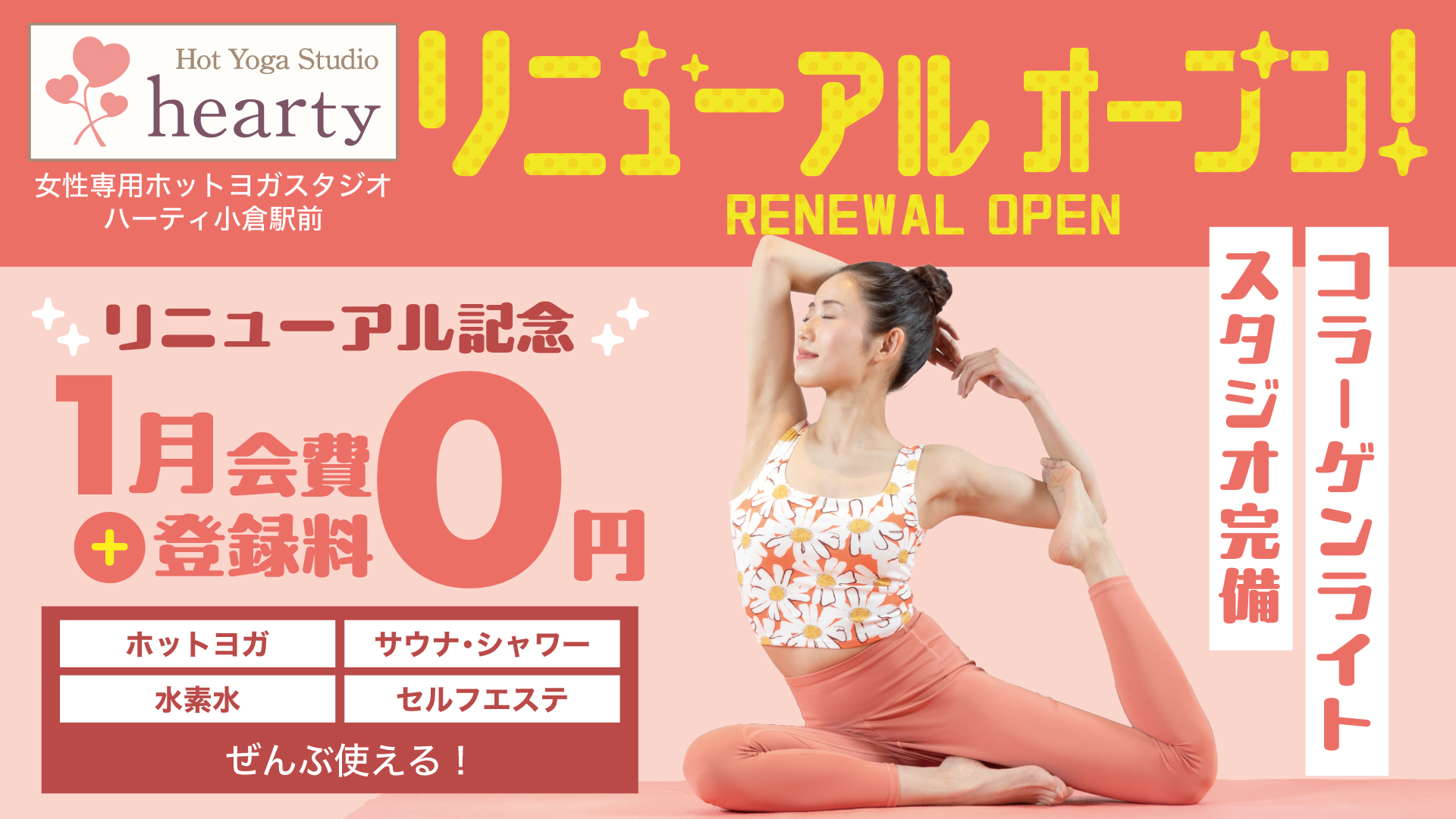 新しい一年を、心地よく整える。女性専用ホットヨガスタジオ「ハーティ小倉駅前」、コラーゲンライト導入でリニューアル