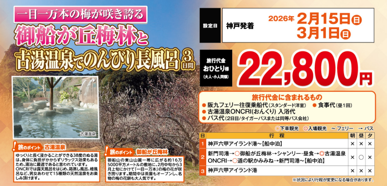 【阪九フェリー関西発団体ツアー】一目一万本の梅が咲き誇る「御船が丘梅林」と古湯温泉ONCRIでのんびり長風呂3日間販売開始!