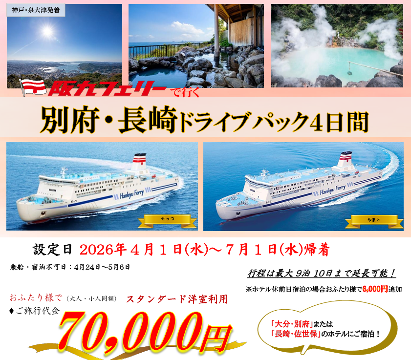 【関西発・阪九フェリー利用】マイカーで春の別府・佐世保へ「別府・長崎ドライブパック」販売開始!