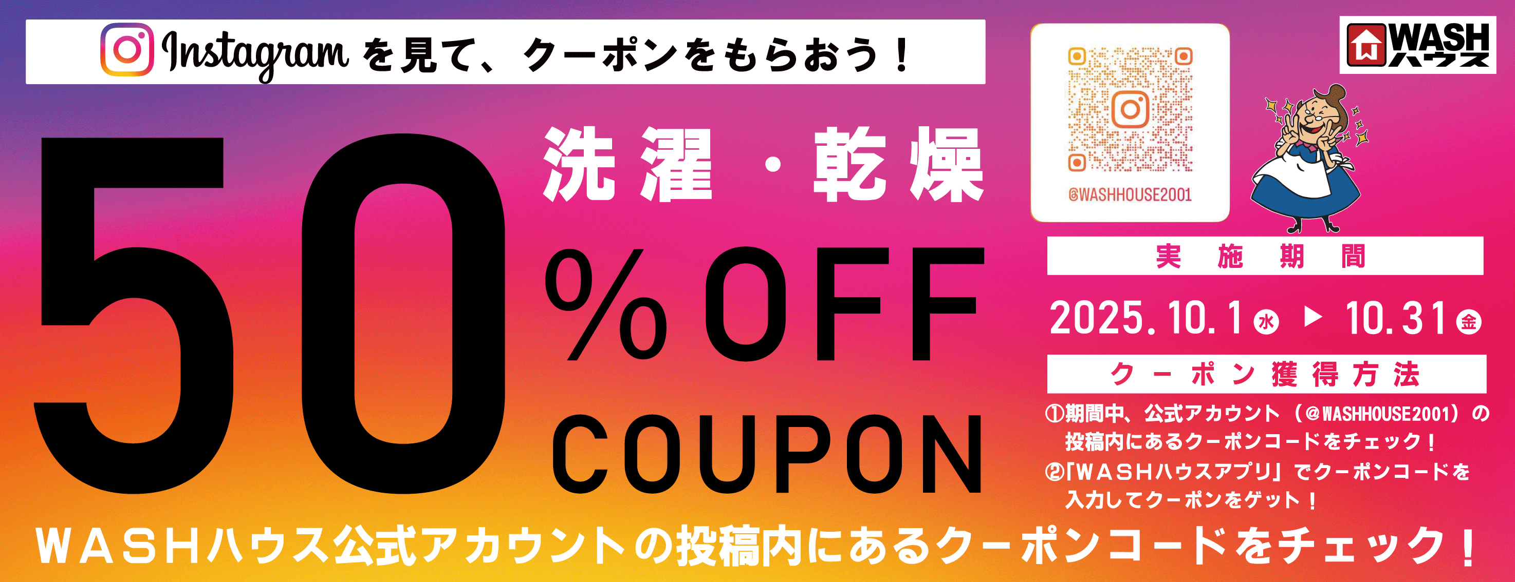 WASHハウスのInstagram公式アカウントの投稿を見て洗濯・乾燥50%OFFクーポンをもらおう!
