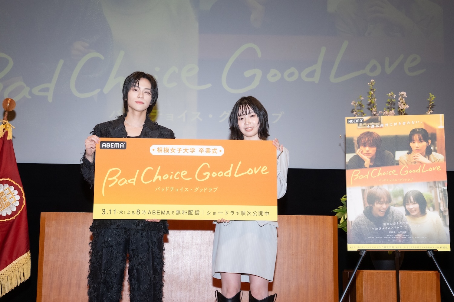 「ABEMA」と「ショードラ」の“縦横連動ハイブリッドドラマ”『バッドチョイス・グッドラブ』主演・宮崎優&山下幸輝がドラマのロケ地・相模女子大学の卒業式に登場し、約1,400人が熱狂
