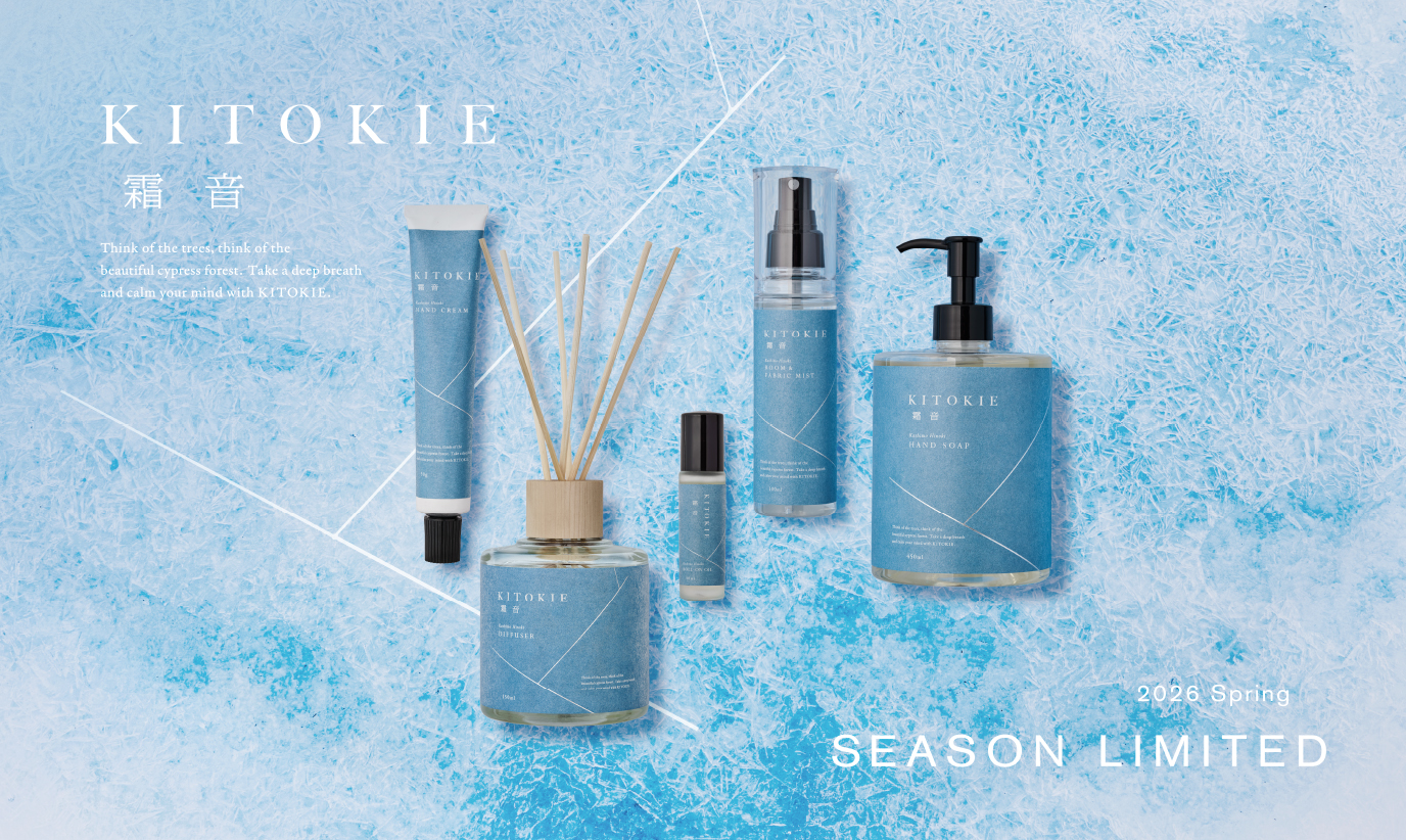 間伐ヒノキを使った「KITOKIE」から、限定の新フレグランス〈霜音〉が登場。静かな緊張感と安らぎが共存する、洗練されたヒノキとハーブの香り。