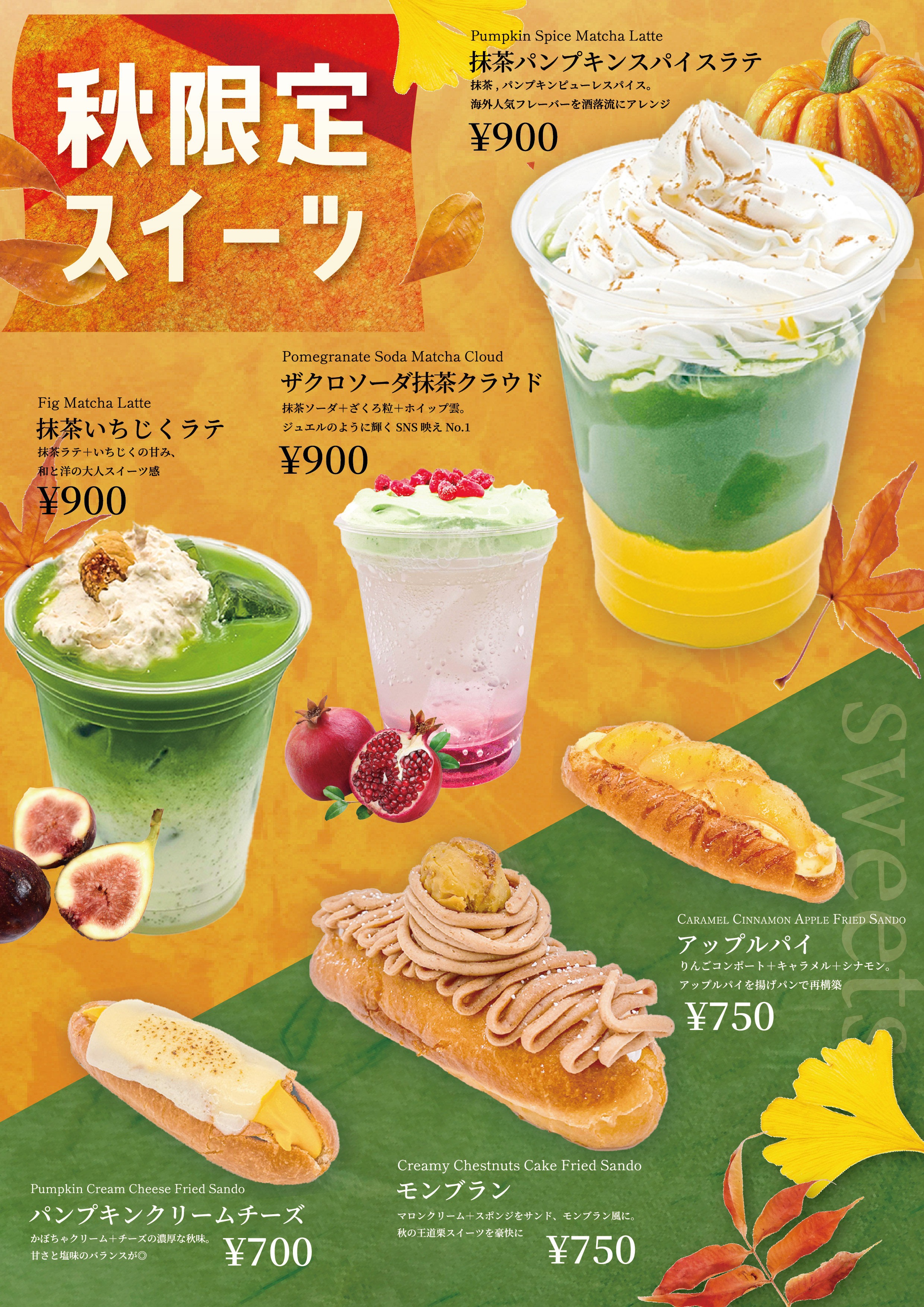 洒落CAFE「FALL Harvest Party」秋限定メニューを提供開始 抹茶と秋の味覚を楽しむ新作ドリンク&進化系あげパン6品が登場