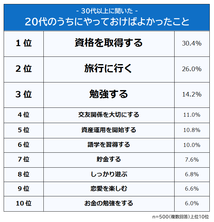 【30代以上に聞いた!20代のうちにやっておけばよかったことランキング】500人アンケート調査