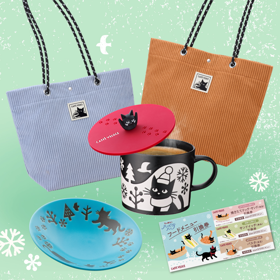 『カフェ・ベローチェ』"黒ねこ"とぬくもりあふれるカフェタイムを。「冬の黒ねこハッピーバッグ2026」を12月4日より発売 穴にはまる黒ねこのマグカバーや風合いを楽しめる美濃焼アイテムでほっと一息!