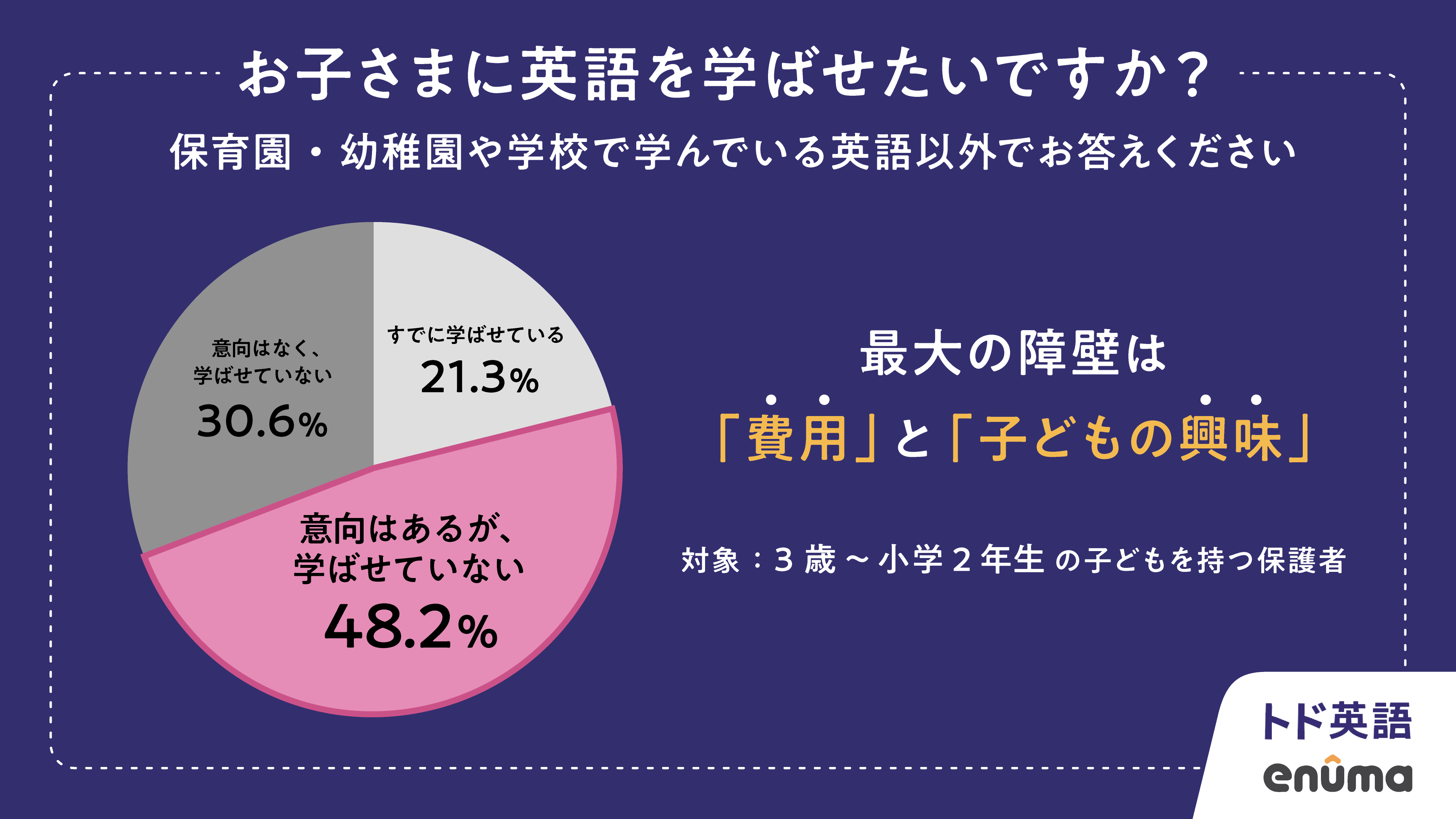 【子ども向け英語学習アプリ「トド英語」が調査】小学3年生の英語必修化から5年、3歳~小学2年生の子どもを持つ家庭が抱える英語教育の理想とギャップ