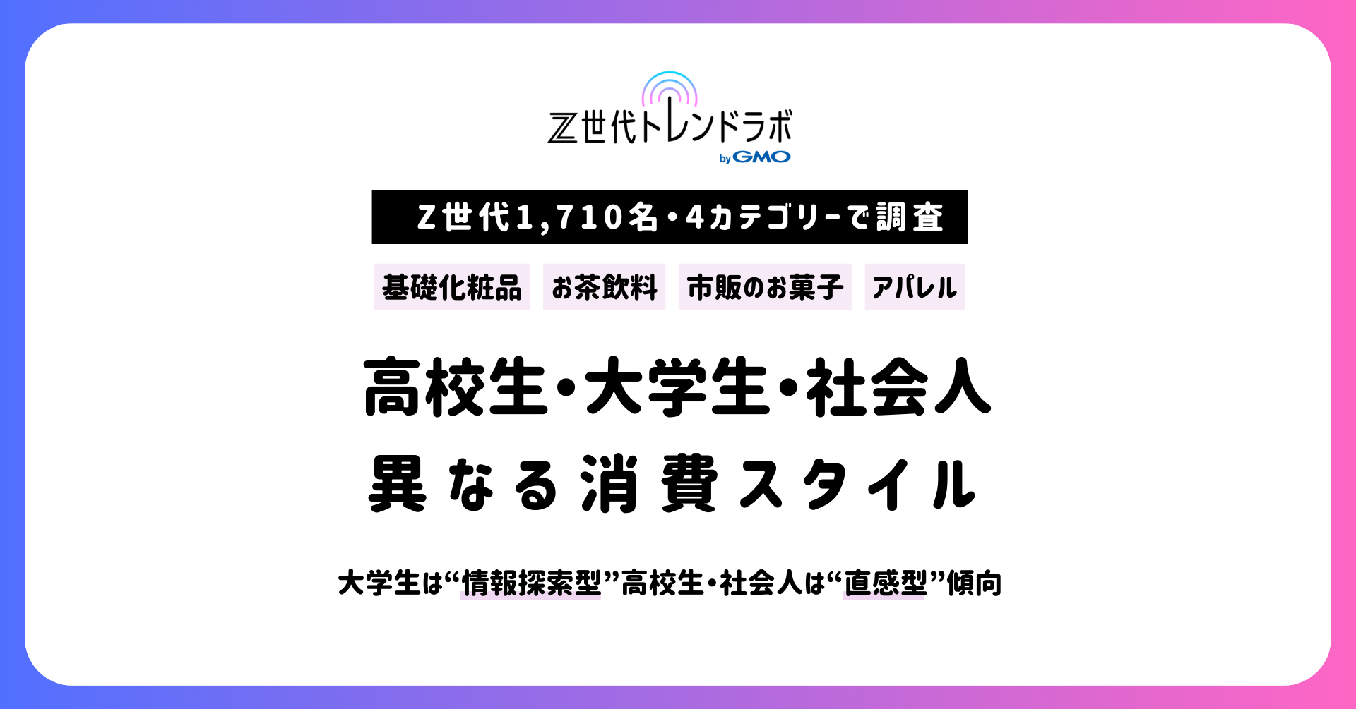 【Z世代トレンドラボ byGMO】Z世代1,710名・4カテゴリー横断調査で判明 大学生は“情報探索型”、高校生・社会人は“直感型”傾向PR TIMES トレンド