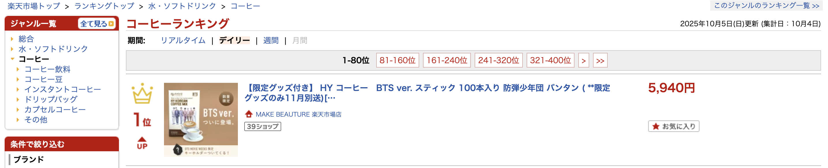HYコーヒーBTS ver. 日本初上陸から初日で楽天コーヒーランキング1位を獲得!