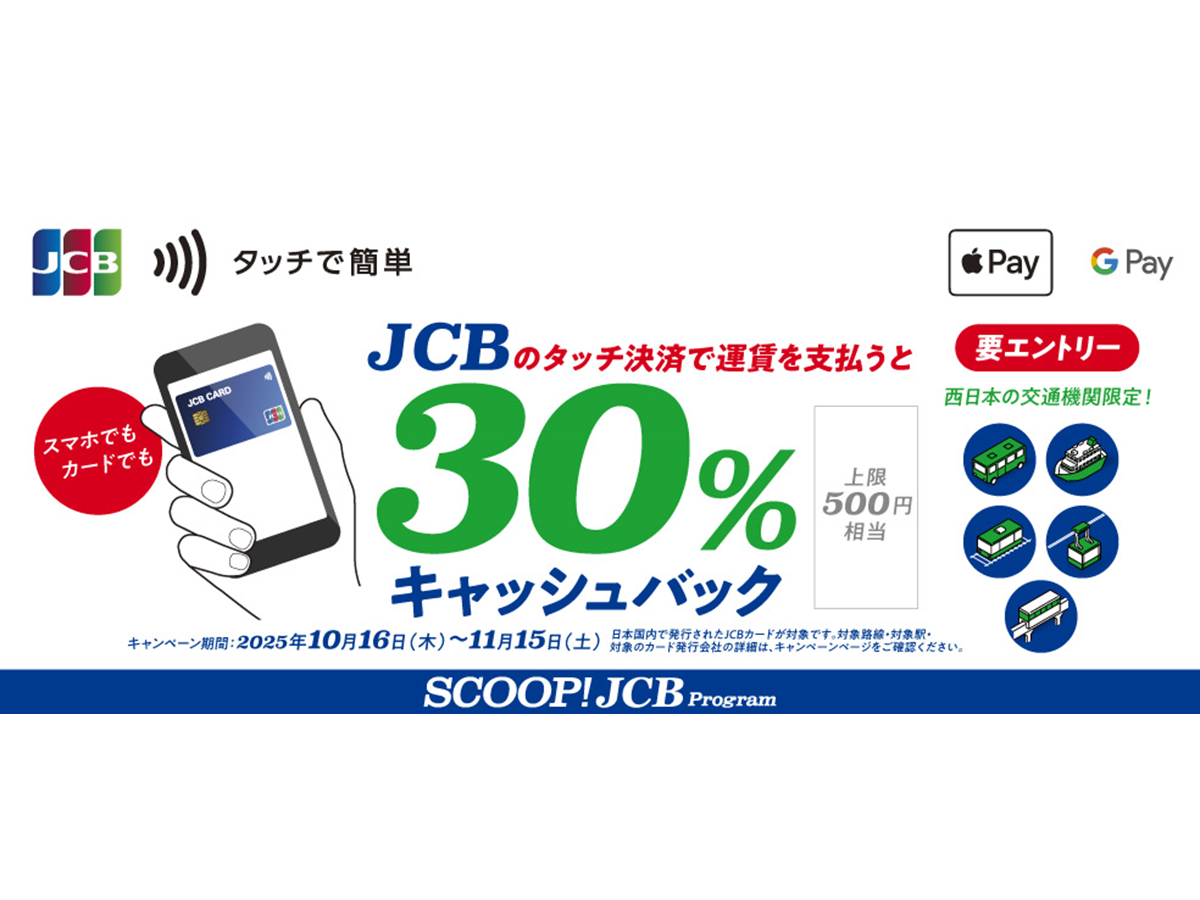 JCBのタッチ決済で、西日本エリアの対象公共交通機関に乗車すると、30%キャッシュバック!