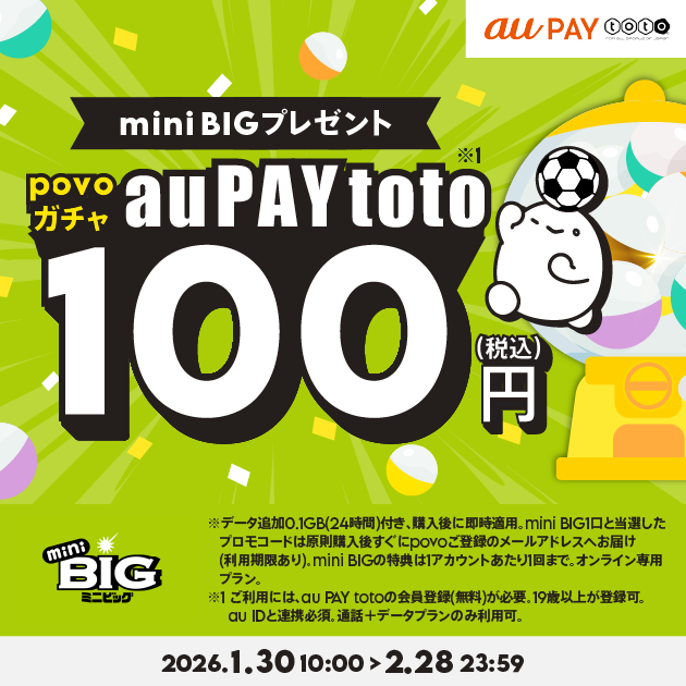 au PAY totoとpovo2.0がコラボ、mini BIGがもらえるpovoガチャを期間限定提供