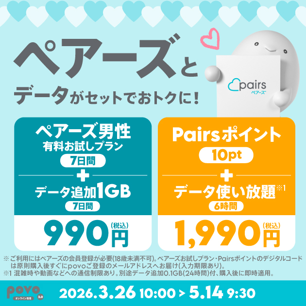 povo、恋活・婚活マッチングアプリ「ペアーズ」とデータがセットになったトッピングを期間限定提供