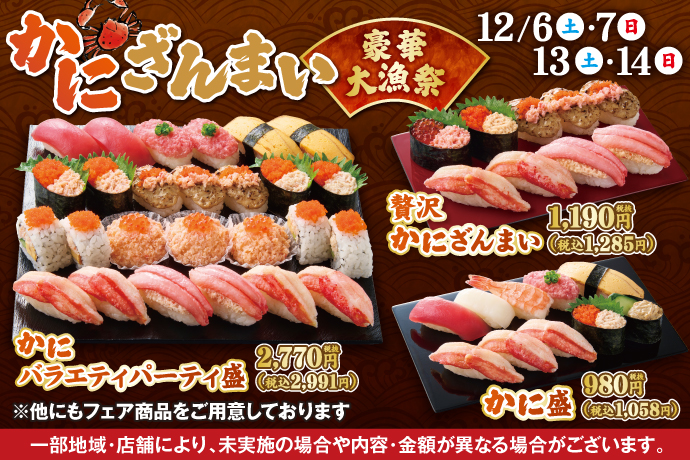 【かに】好きさんに朗報!小僧寿しでは、人気の【本ずわいがに】とジューシーな甘みと旨味で食べ応えのある【紅ずわいがに】を使った『かにざんまい!豪華大漁祭』を12/6(土)~開催します!
