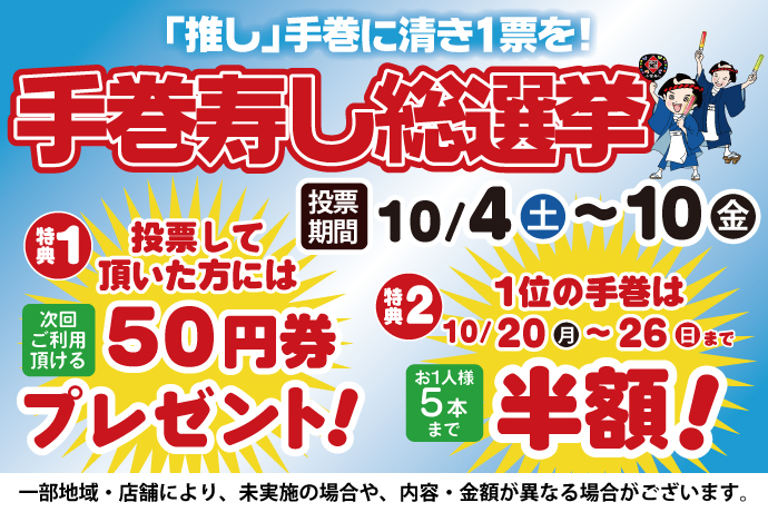 「【推し】手巻に、清き1票を!!」小僧寿しでは「手巻寿し総選挙」を開催!10月4日(土)~投票開始!バラエティ豊かな手巻寿しから人気NO.1を決定する、投票イベントです!お得なキャンペーンも開催!