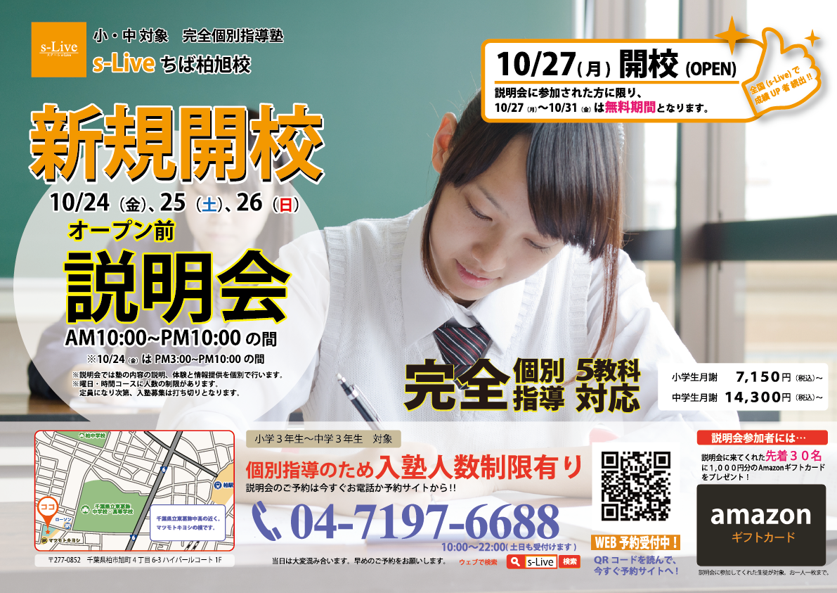 【千葉県柏市にNewオープン】東大生を始めとする難関大学生講師が教える「個別指導塾s-Liveちば柏旭校」が10月27日に新規開校。小・中学生のご家庭を対象に開校前説明会を3日間開催。