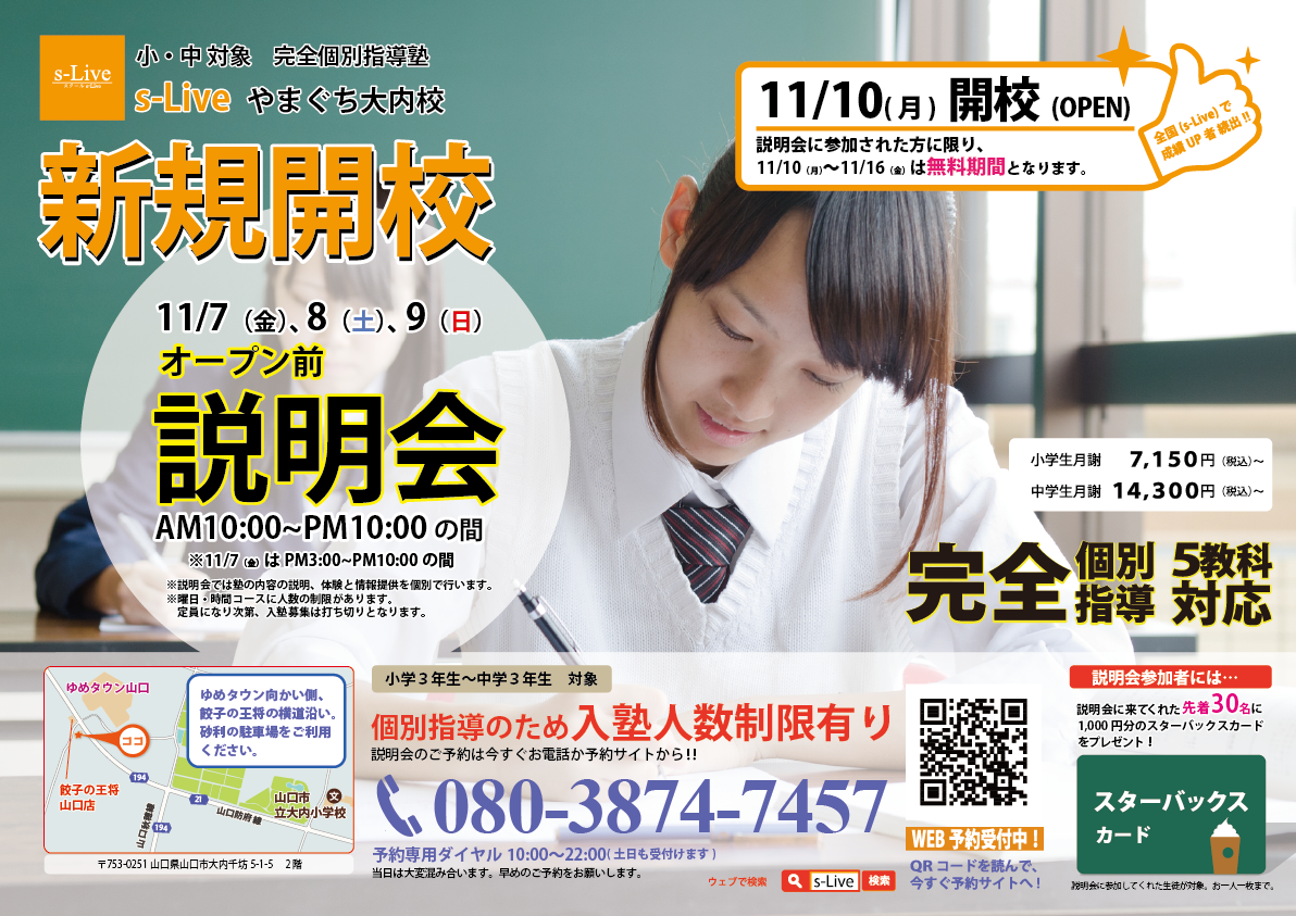【山口県山口市にNewオープン】東大生を始めとする難関大学生講師が教える「個別指導塾s-Liveやまぐち大内校」が11月10日に新規開校。小・中学生のご家庭を対象に開校前説明会を3日間開催。
