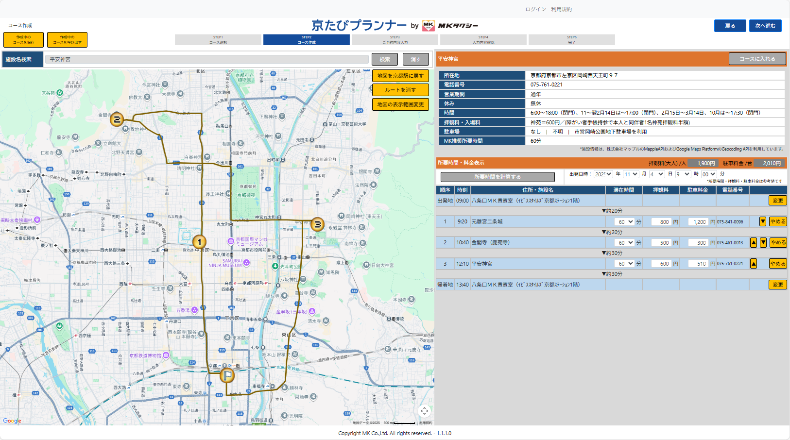 観光スポットを選んでマッピング、タクシー移動時間も自動計算 京都観光の行程を作成できる無料WEBサービス「京たびプランナー by MKタクシー」サービス開始!
