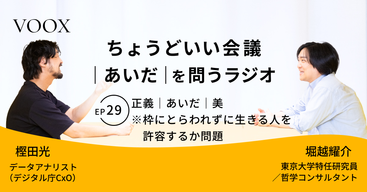ちょうどいい会議|あいだ|を問うラジオ『Ep29: 正義|あいだ|美 ※枠にとらわれずに生きる人を許容するか問題』音声教養メディアVOOX/Spotifyにて、配信開始!