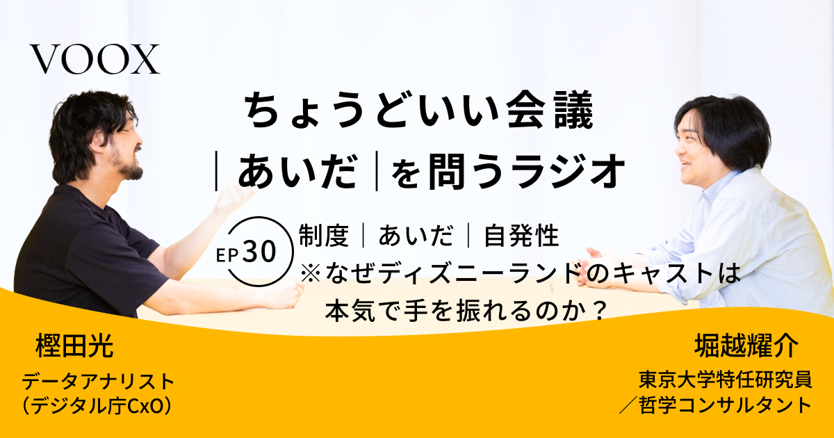 ちょうどいい会議|あいだ|を問うラジオ『Ep30: 制度|あいだ|自発性 ※なぜディズニーランドのキャストは本気で手を振れるのか?』音声教養メディアVOOX/Spotifyにて、配信開始!